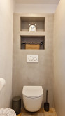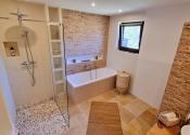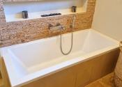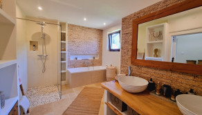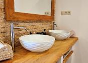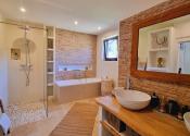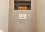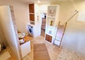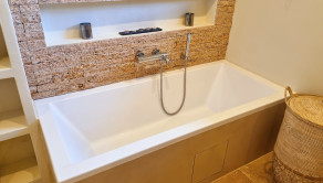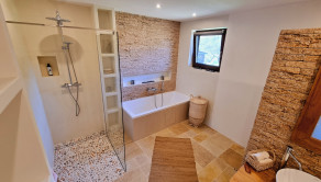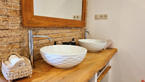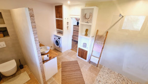 Kúpeľňa a technická miestnosť: nová kúpeľňa s prírodnými materiálmi: travertínová podlaha, riečny kameň, brúsený cement, značkové vybavenie (Geberit, dizajnové batérie), nábytok z ibizenskej borovice na mieru, nové WC s predprípravou na práčku a sušičku v pivnici (zateplený priestor)
