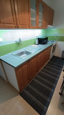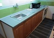 kuchynská linka so spotrebičmi (mikrovlnná rúra, rýchlovarná konvica)